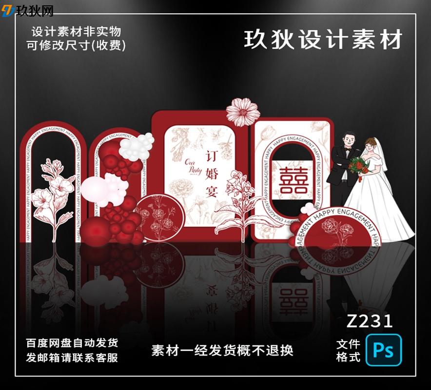 Z199红色新中式订婚宴回门宴结婚派对背景设计素材源文件