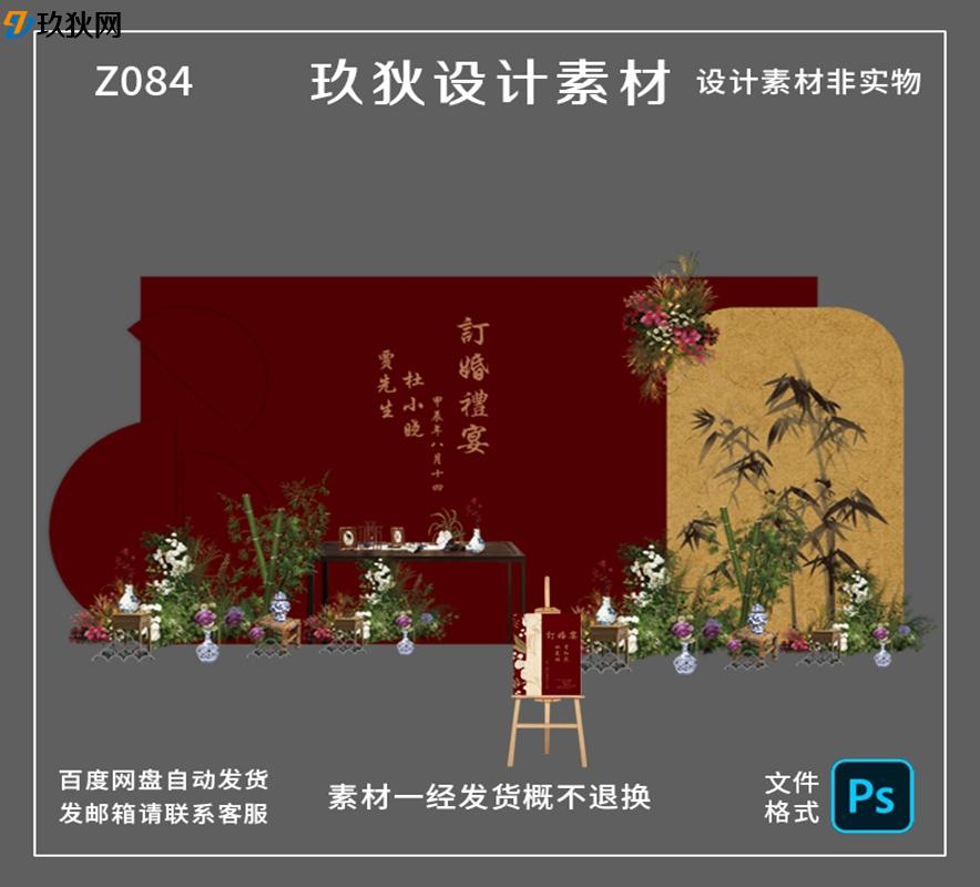 Z199红色新中式订婚宴回门宴结婚派对背景设计素材源文件