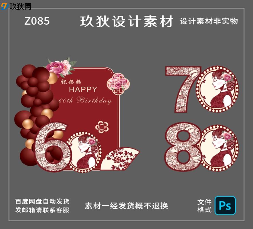 Z085中式红色旗袍母亲生日派对长辈寿宴布置背景板设计素材源文件