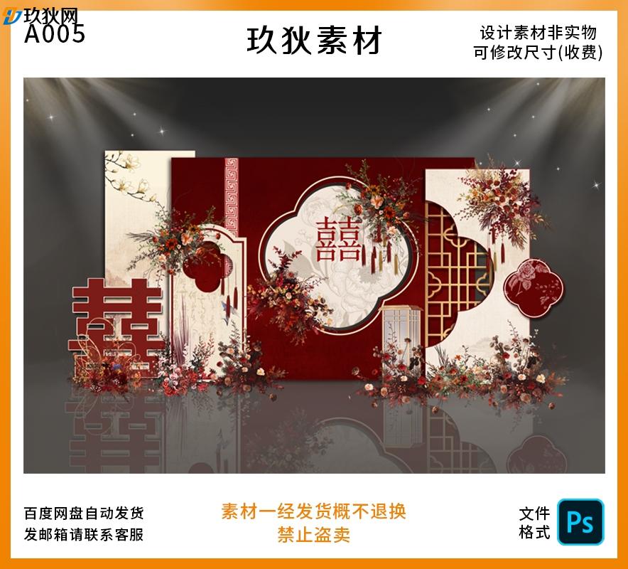 A007复古红色香槟色新中式订婚宴婚礼布置婚庆背景kt板PS设计素材