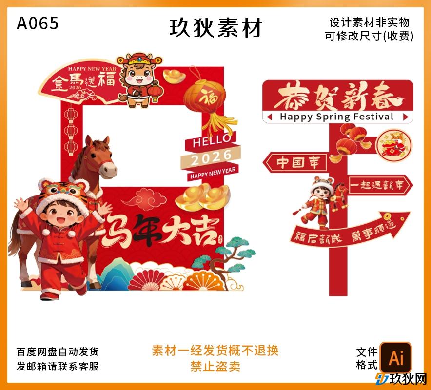 A065马年元旦春节除夕商场年会布置迎宾区打卡背景指引牌素材